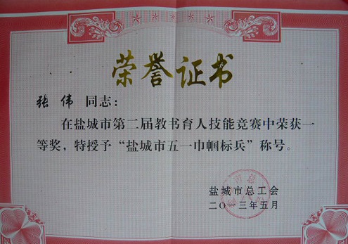 在由盐城市总工会、盐城市教育局联合组织的盐城市第二届教书育人技能竞赛中,我院纺工系辅导员张伟老师表现优异,荣获一等奖并被授予“盐城市五一巾帼标兵”荣誉称号。