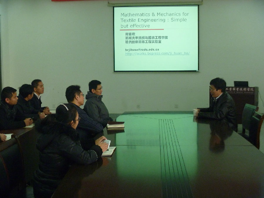 何吉欢教授在数学应用于纺织方面具有很深的学术造诣,已发表SCI论文270多篇,他引次数达到12500多次。其中27篇文章引用次数超过100次(其中7篇文章引用次数超过500次),单篇最高引用率达到984次(他引用936次),2008年获得首届科学前沿——中国卓越研究奖(24名之一),现有发明专利37项,实用新型专利33项。本次讲座中,何教授深入浅出的介绍了数学、力学如何与纺织有效的结合,讲座中通过数学分析方法幽默的讲解了“羊毛出在羊身上”的基本原理、形象化的表述了质量守恒和能量守恒原理在赛络纺、赛络菲尔纺、涡流纺、气流纺等纺纱方法上的数学建模,以及分形数学热传导原理在北极熊羽毛上的应用,生动的讲解了具有国际首创领先技术的气泡静电纺丝原理及数学建模等。讲座结束后,何吉换教授就我系的老师提出的“如何从数学走入纺织、纺织如何走进数学”等问题进行了解答。