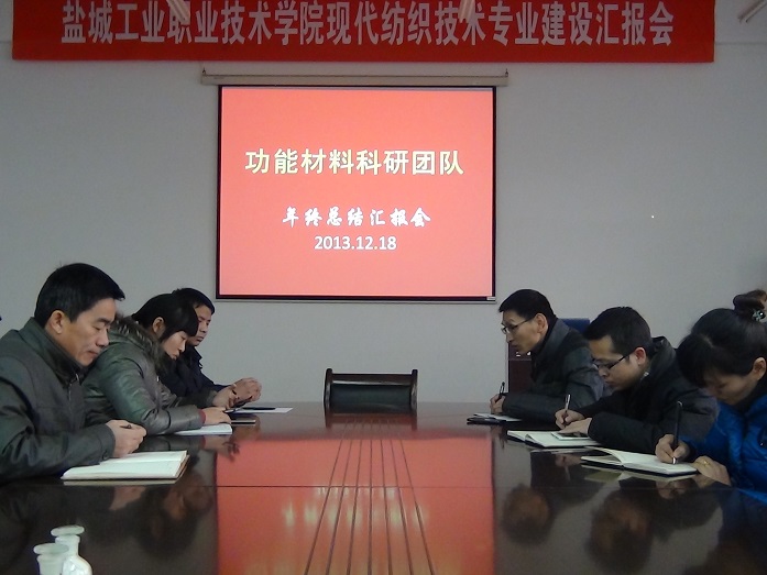 2013年12月19日,纺织工程系功能材料科研团队在系部会议室召开2013年度年终总结汇报会。会上,科研团队负责人刘华教授总结了本年度团队的科研工作,并要求团队各成员进一步拓展自己的研究方向,能在2~3年内有一个稳定的研究方向并作深入研究,要及时将研究内容转化成高水平、高质量的科研成果,刘主任还就下一年度的省市级以上各类科研项目的申报作了相关部署。随后,团队成员就各自的研究内容作了相应总结,并对下一年度预申报的科研项目作了汇报。团队对各成员的研究方向和预申报的课题的可行性进行论证和指导。最后,刘主任要求大家能相互交流帮助,将自己的研究常态化,充分利用好学院的各种先进仪器设备,多出成果、早出成果,为将我院建设成为省级示范高职院作出贡献。