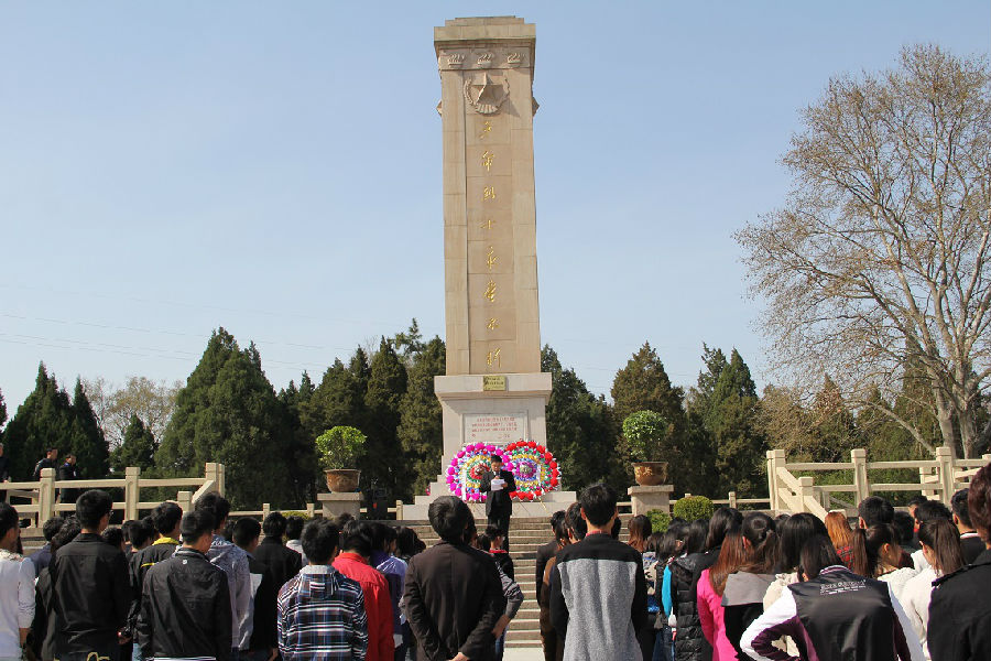 在团员代表向烈士们敬献花圈、全体师生默哀一分钟后,团委陈杰书记带领全体同学举行了重温入团宣誓仪式。团员代表校学生会主席李念龙同学在发言中谈了自己对扫墓活动的认识,并表示将在今天这样美好的环境下努力把握机会学知识、长才能、成栋梁。学工处沈长生处长在讲话中带领同学们回顾了革命战争年代的艰苦岁月,鼓励同学们学习革命先烈崇高的爱国主义精神和坚定的社会主义信念;艰苦奋斗、顽强不息的拼搏精神;勤于学习、不倦探索的求知精神。全体师生绕烈士纪念碑一周进行了瞻仰。