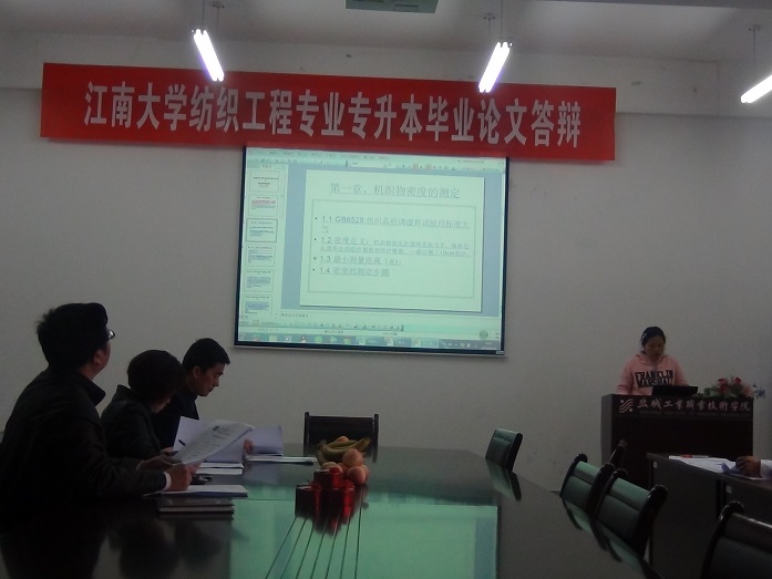4月26日上午,江南大学盐城工业职业技术学院函授站 2012级“专升本”纺织工程专业毕业答辩工作在纺织服装学院开展。