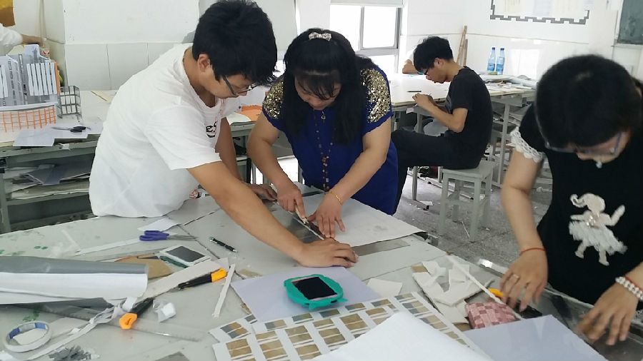 该课程教学周数为4周,以学校各个建筑楼群的仿真设计制作为项目,采用教学做一体化,车间式师徒化模式,纯手工设计制作实物模型。项目制作从任务分工→设计构思→材料准备→绘制建筑模型项目任务的工艺图→排料画线→部件加工→部件装饰→修整组合成型→环境配置→整体安装到最后的整体修饰、完善,时间紧、任务重,除了课余时间和自习课外,班级学生还充分利用午休和周末时间,加班加点,甚至通宵达旦。通过课程的训练,切实培养和锻炼了学生实践动手能力、社会适应能力、团队协作精神。