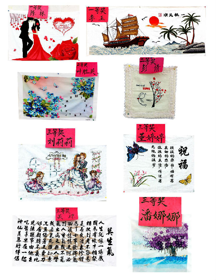 中国刺绣是中国文化宝库中的一颗明珠,其中以江苏的苏绣、湖南的湘绣、广东的粤绣和四川的蜀绣最为特色,合称中国四大名绣。盐城,发绣艺术的发源地,东台发绣堪称天下一绝。在中国四大名绣和盐城发绣两块展板中,苏绣的精细素雅,湘绣栩栩如生的狮虎,粤绣的繁而不乱,蜀绣的浑厚圆润,发绣的古朴典雅给广大学生以震撼,自豪中国优秀的传统文化,惊叹手工艺者精湛的技艺。而以作品选材、色彩搭配、正反面整齐度为标准评选出的二十二件十字绣绣品则吸引许多学生驻足观看。
