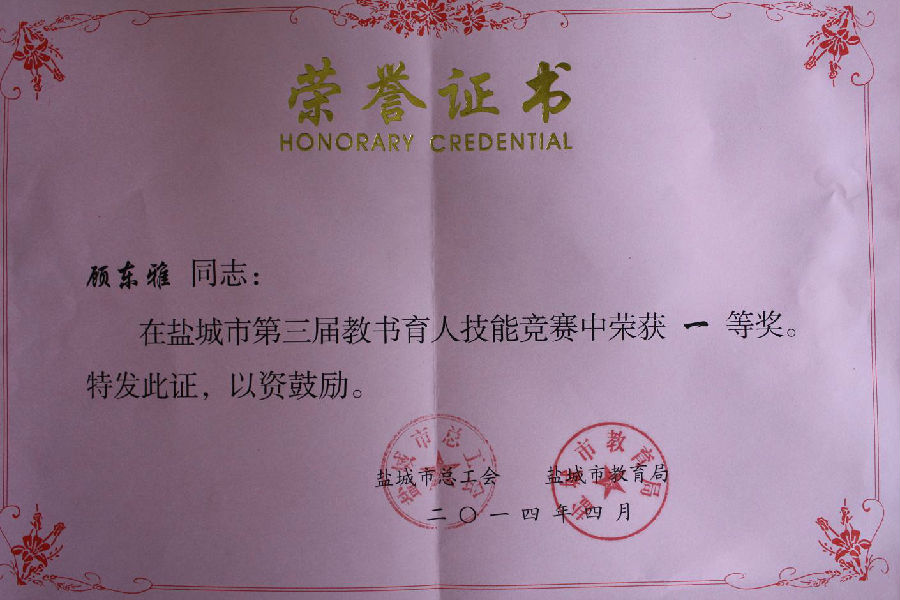 4月份,盐城市教育局、盐城市总工会联合举办了第三届教书育人技能竞赛,来自驻盐高校、中专校和市直学校等40个单位的49位选手参加比赛。比赛中,轻化工程系顾东雅老师表现突出,荣获一等奖,同时被授予“盐城市五一巾帼标兵”荣誉称号。