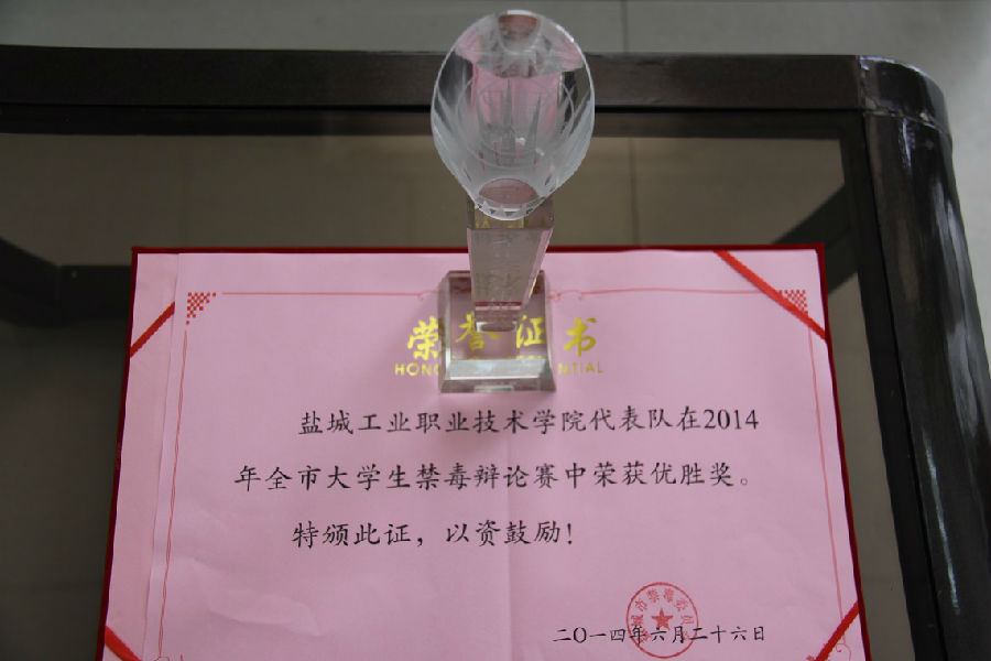 由盐城市禁毒委员会主办、盐城师范学院承办的2014年盐城市大学生禁毒辩论赛,我校代表队获得优胜奖,经贸管理学院梁紫琪同学获得本次辩论赛最佳辩手称号。