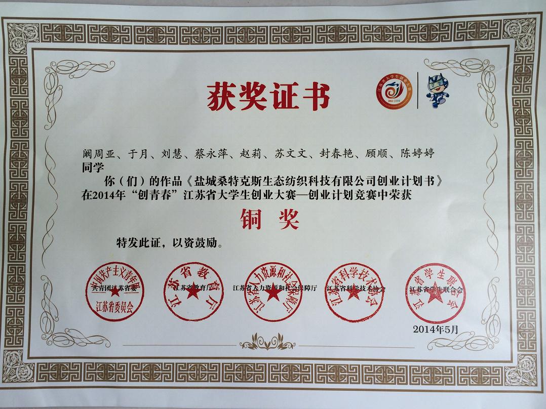 5月23至25日在江苏省“创青春”全省大学生创业计划比赛决赛中,我校刘慧、于月、苏文文、蔡永萍四名同学参加了现场汇报与答辩,作品《盐城桑特克斯生态纺织科技有限公司创业计划书》荣获铜奖。