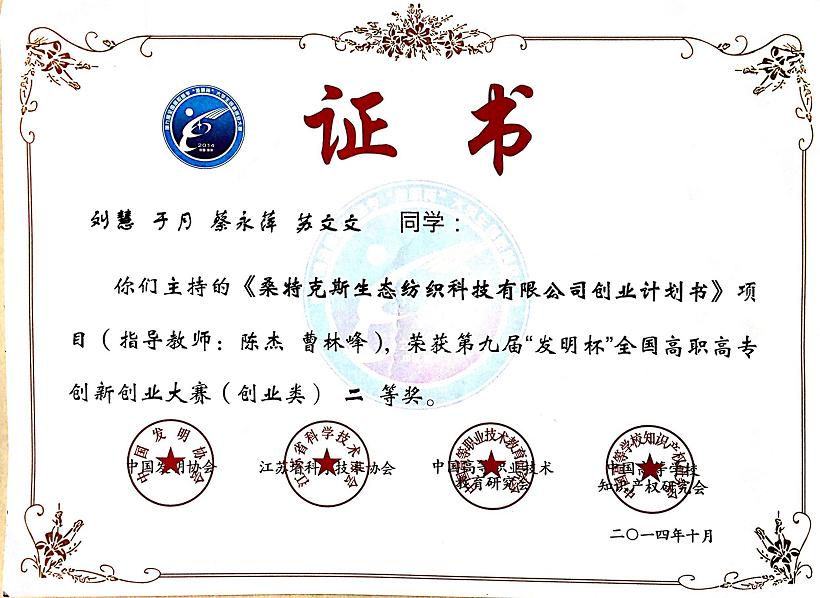 10月17-19日,在南京工业职业技术学院承办的第九届“发明杯”全国高职高专创新创业大赛中,我校刘慧、于月、蔡永萍、苏文文四名同学参赛的作品获得二等奖。