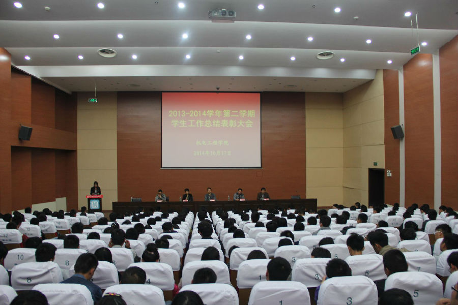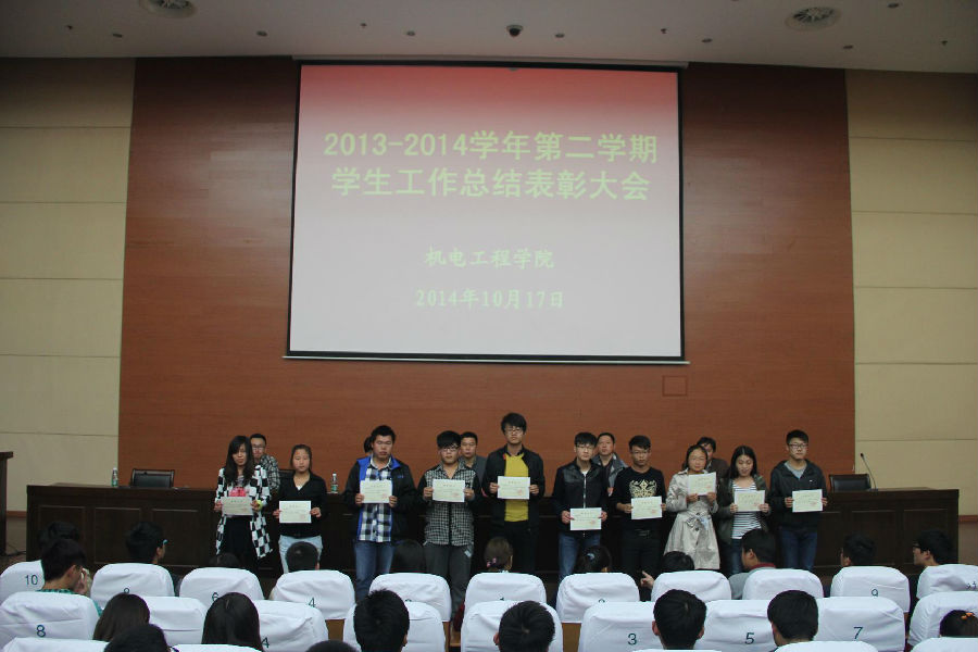 10月17日晚,机电工程学院2013-2014学年第二学期学生工作总结表彰大会在学术报告厅召开。学工处处长沈长生,机电工程学院副院长王宜君、副院长张国志,团总支书记李明以及12、13级各班部分获奖代表、14级全体新生、班主任参加了大会。副院长姚月琴主持会议。