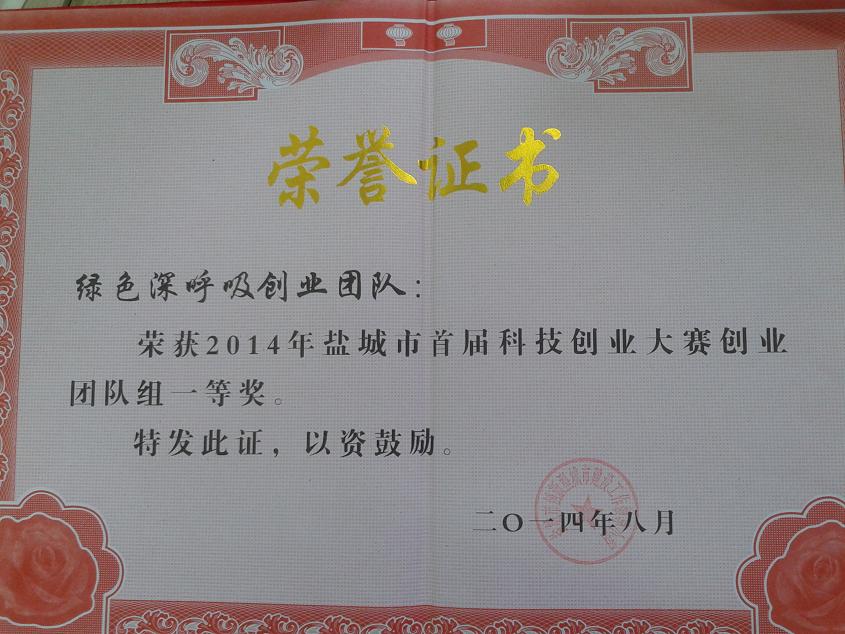 近日,盐城市首届科技创业大赛在盐城市政府三楼礼堂举行了颁奖仪式,我校纺织服装学院的赵磊、张圣忠、位丽、王前文四位老师,孙彤彤、周瑞两位同学,经贸管理学院的丁金兰老师,与苏州大学现代丝绸国家工程试验室何吉欢教授组建的“绿色深呼吸”团队获得了创业团队组一等奖的好成绩。此次大赛共有35个创业团队参赛,王荣平市长为“绿色深呼吸”团队代表赵磊老师颁奖。