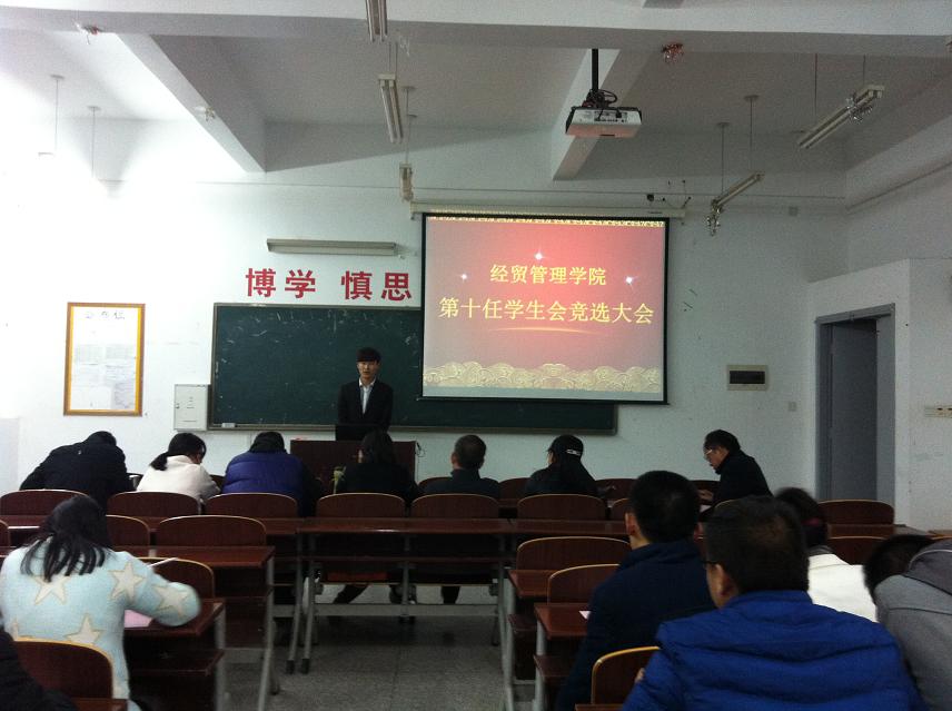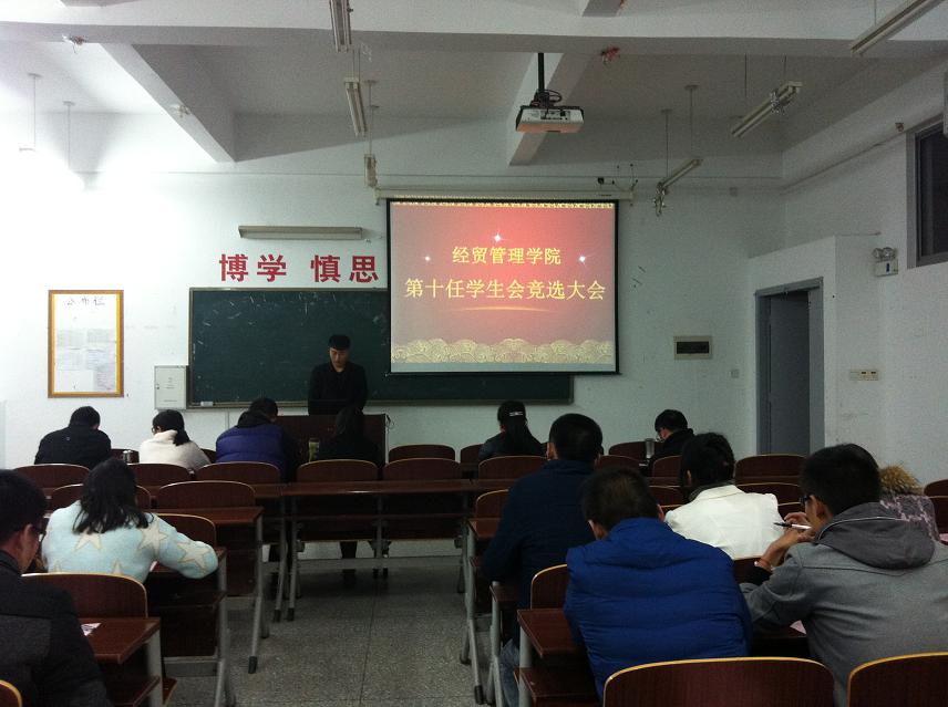 11月19日、20日下午,经贸管理学院第十任学生会主席和各部部长、副部长竞选大会在经贸组团110教室举行,经贸管理学院副院长李荣道,辅导员薛志俊、郑志雯、张君,老师代表侯同娣、蔡亚轩、孙鑫及学院第九任学生会副部长以上同学参加了大会。