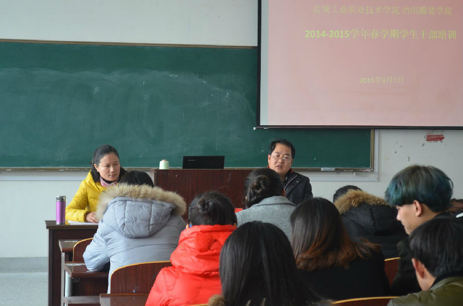 3月7日下午,纺织服装学院2014-2015学年春学期学生干部培训会议在纺工楼408召开。纺织服装学院副院长陈瑜、团总支书记张伟出席会议,学生会主要学生干部以及2014级、2013级各班班长、团支书参加会议。
