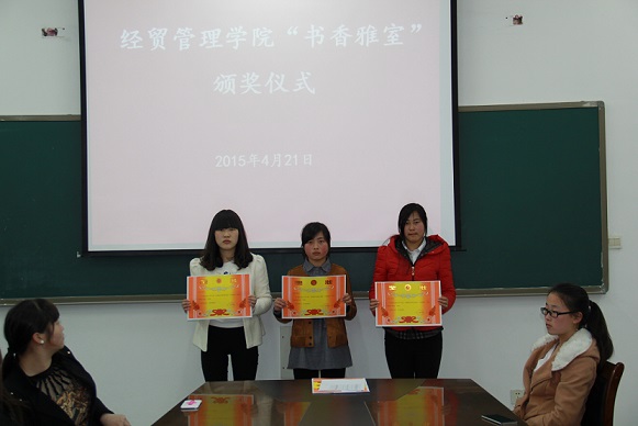 4月21日晚,经贸管理学院在308会议室举行了“书香雅室”评比活动颁奖仪式。为期20天的宿舍评比活动画上了圆满句号。辅导员张君老师、学生会生活部负责人和获奖宿舍的舍长出席了本次活动。