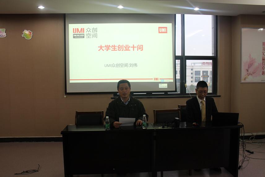 11月25日下午,建筑工程学院邀请盐城大道网络公司、UMI众创空间创始人刘伟总经理在创业园405会议室做了“大学生创业十问”主题讲座,建筑工程学院党总支副书记、副院长王权,各班主任老师以及建筑工程学院近80名创业爱好者聆听了本次讲座。