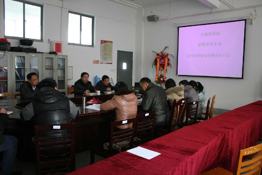 12月29日,九洲药学院召开染整技术专业现代学徒制教学研讨会,教务处副处长吴益峰、九洲药学院副院长宣志强、染整技术教学团队全体教师等出席会议。会议由九洲药学院院长刘德驹主持。