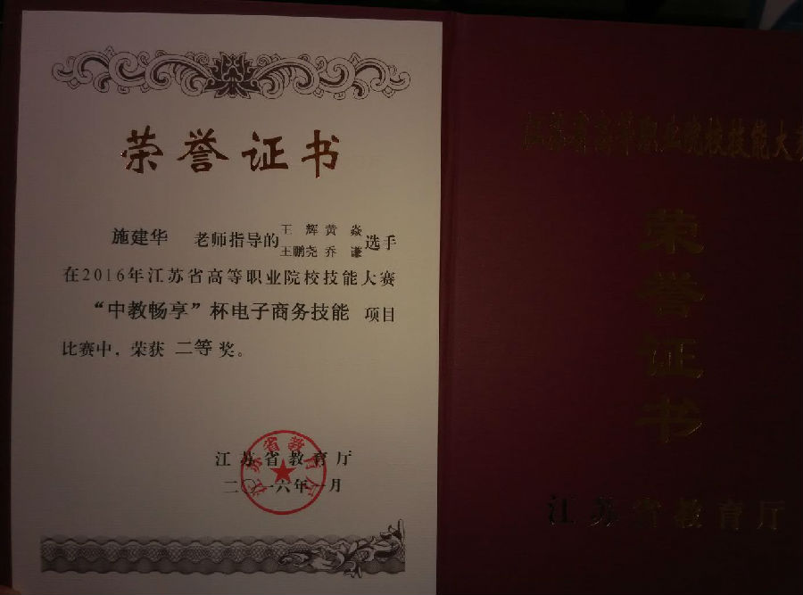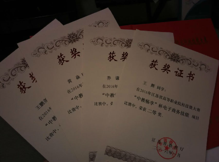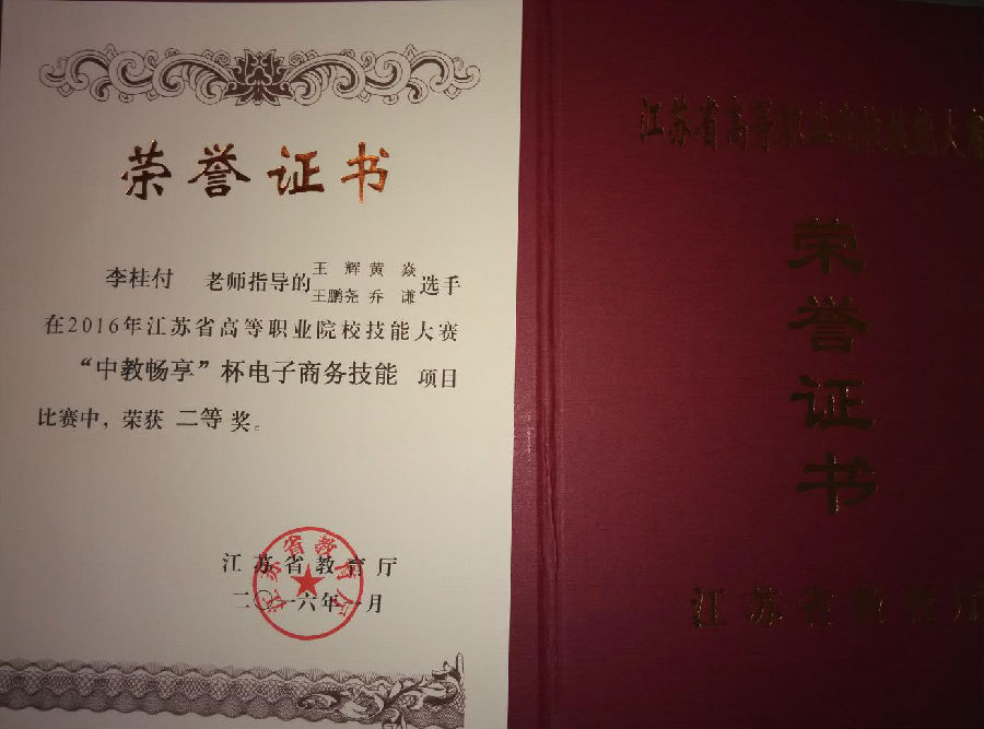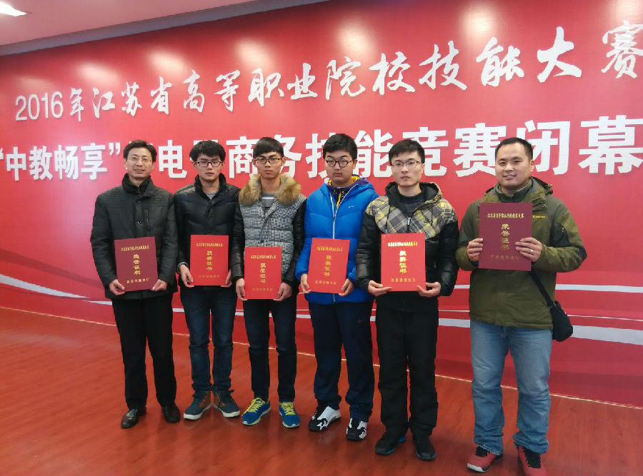 近日,2016年江苏省高等职业院校“中教畅想”电子商务技能竞赛在徐州工业职业技术学院举行,来自全省高职院校40支代表队参加了角逐。经贸管理学院会计1415班王辉、黄焱和会计1511王鹏尧、乔谦4位同学组成的参赛团队,经过李桂付、施建华老师近一个月的精心训练和周密安排,最终荣获团体二等奖,电子商务技能比赛总分名列江苏省电子商务技能参赛团队第6名。李桂付、施建华荣获优秀指导老师称号。