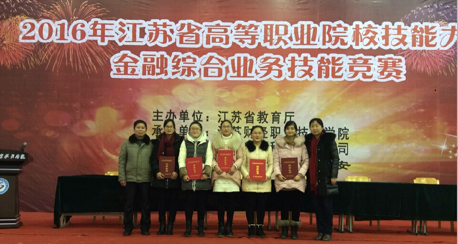 1月10日,2016年江苏省高等职业院校金融综合业务技能大赛在江苏财经职业技术学院举行。由经贸管理学院会计1417班万红、沈新艳、蔡芳三位同学组成的参赛团队,经过周娜、陈剑侠老师近两个月的悉心指导,最终荣获团体一等奖(第2名)的佳绩。本次大赛共有16支代表队参加,赛项共设立了银行柜面业务、投资理财业务和银行手工技能三个子模块。在综合业务比赛环节,参赛选手需在2个小时内独立完成柜面和投资理财业务;在手工技能比赛环节,每队3名选手分别参加点钞、传票算、字符输入中的一项业务技能。