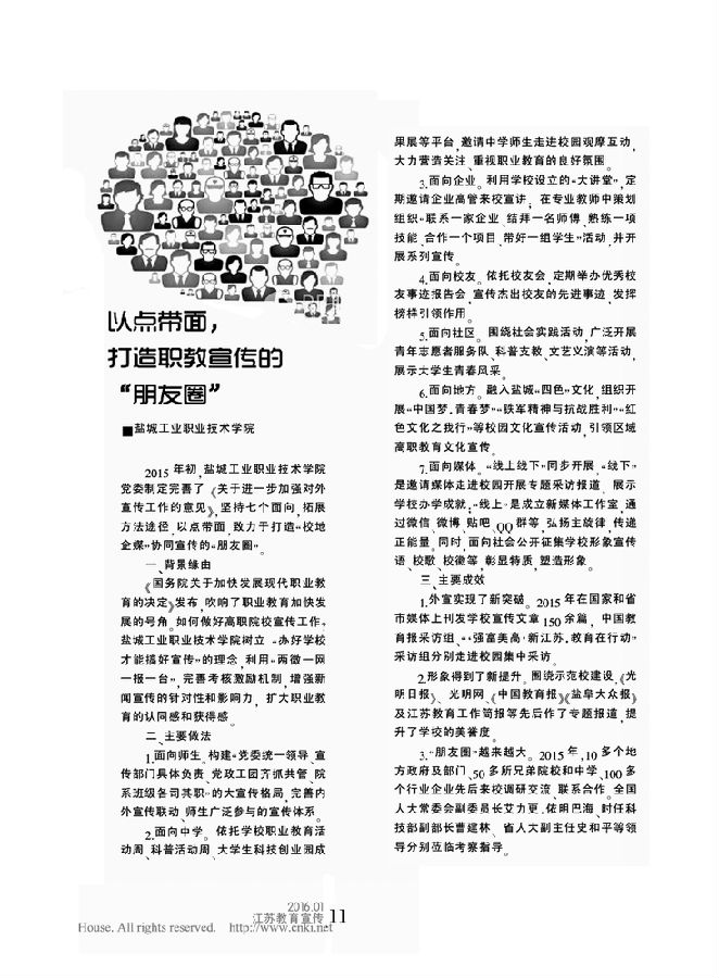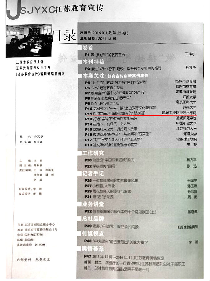近日,省教育厅公布《2015年全省教育新闻宣传工作创新案例》,我校报送的《以点带面,打造职教宣传的“朋友圈”》成功入选,并刊登在《江苏教育宣传》杂志上。据悉,全省共有9所高校宣传创新案例入选,我校是唯一入选的高职院校。