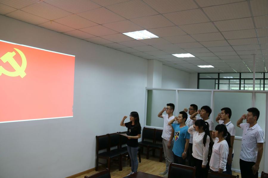 在庄严的国际歌奏响之后,包婷婷宣布了2016年第一批发展的8名学生党员名单,这也是建筑工程学院大家庭迎来的首批新党员。随后,由学生支部书记包婷婷领誓,新党员面对鲜红的党旗,庄严地举起自己的右手,对党宣誓。