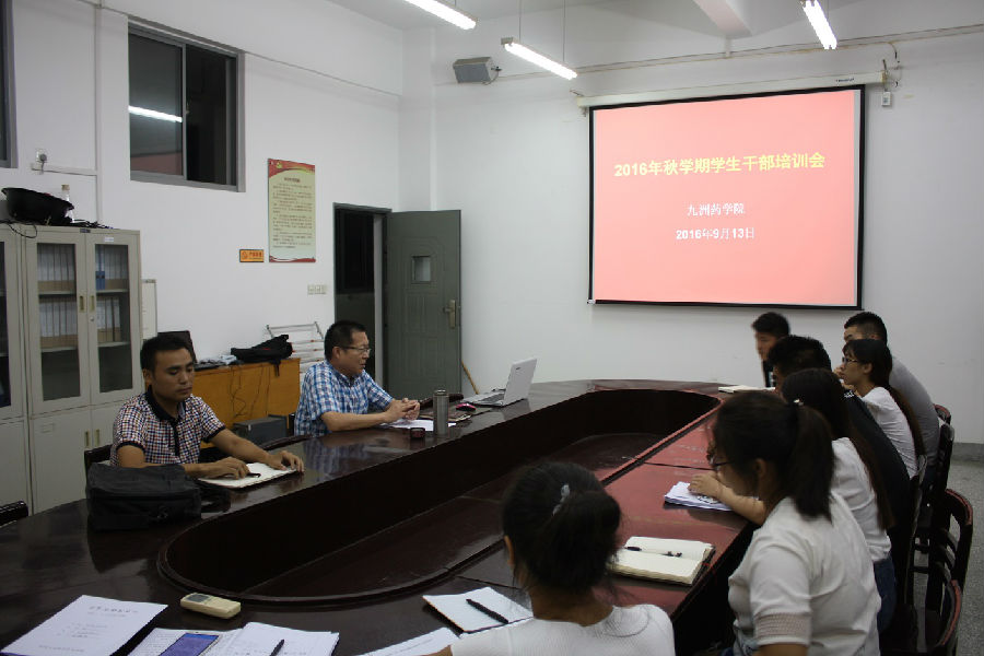 9月13日,九洲药学院在305会议室举办2016年暑期学生干部培训,九洲药学院党总支书记高兆昶出席会议,全体学生会干部和各班班长、团支书参加培训。