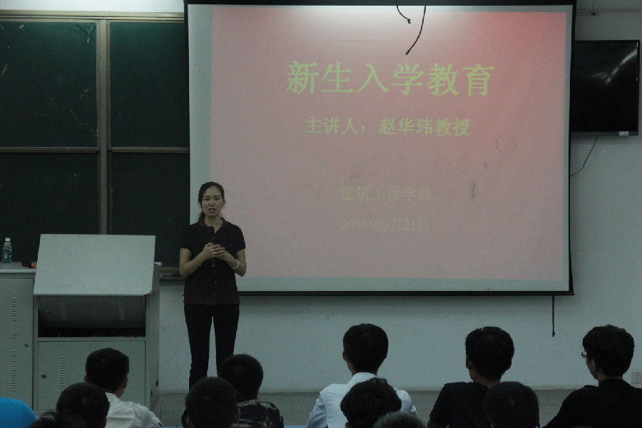 在新生入学教育会上,赵华玮详细介绍了建筑工程学院的筹备、成立、发展的历程,建筑工程学院的发展壮大也表明了建筑行业是朝阳产业,勉励全体新同学要树立专业自信、坚定专业思想,努力学习争取提升学历层次,还要尽早思考自己的人生职业规划。她强调同学之间要学会包容、学会相处,尽快适应校园生活、学习环境。最后,赵华玮向全体2016级新生提出了四点建议:一要提高自身修养;二要有积极的心态;三要学会寻求他人帮助;四要懂得感恩。