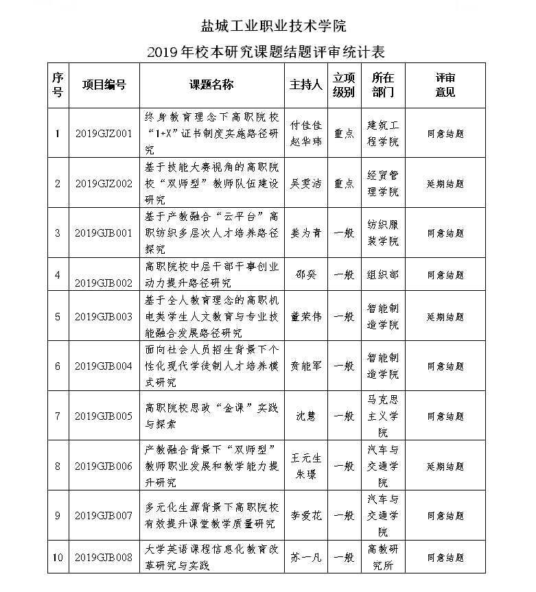 近日,高教研究所组织专家对2019年校本研究课题申请结项的项目进行验收,现对验收结果予以公示,具体名单附后。如有异议请于1月14日前与高教研究所联系(联系电话:89803926)。