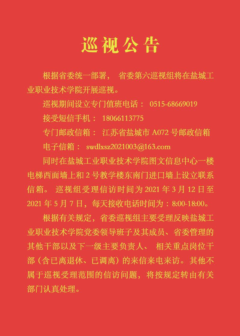作者:来源:盐城工业职业技术学院审核人:发布部门:党委办公室、院长办公室发布时间:2021-03-12 16:24:08访问量:1824