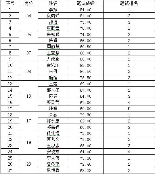 根据《盐城工业职业技术学院2021年公开招聘教师公告》要求,岗位中同一岗位通过资格审核的人员超过20人,则考试方式增加笔试或技能测试。因此04、05、07、08、13、17、19、24号岗位增加笔试,23号岗位增加技能测试。学校于2021年6月20日组织了公开招聘笔试/技能测试考核,现将进入面试考核的应聘人员的成绩公告如下: