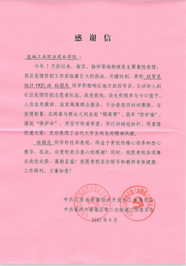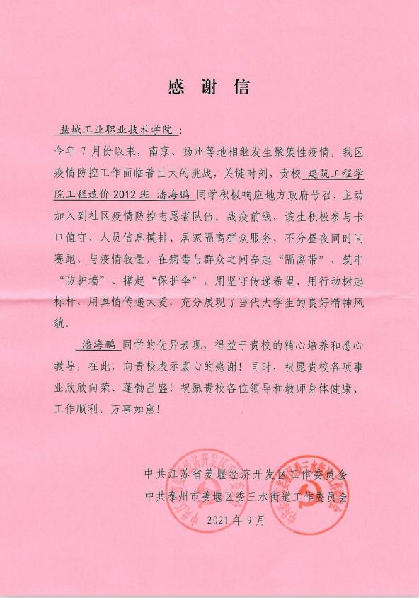 近日,我校陆续收到姜堰经济开发区党工委、宝应县安宜镇团委和姜堰区罗塘街道怡园社区发来的感谢信,信中对建筑工程学院工程造价2012班潘海鹏,智能制造学院电气2031班陈瑞波,经贸管理学院统计1921班孙国庆,物流2011班张欣宇、钱海涛等同学提出了表扬和感谢。