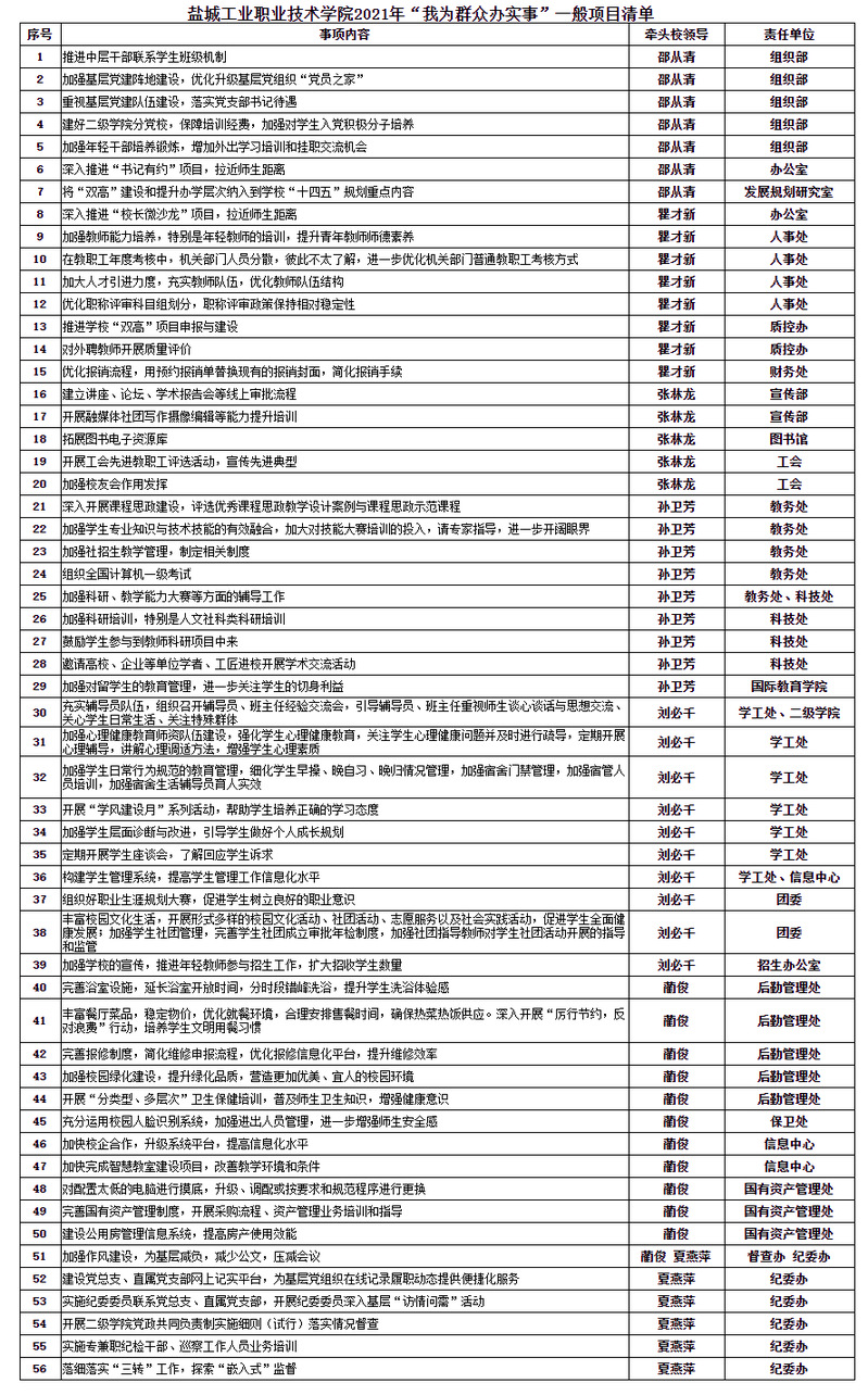 根据上级“我为群众办实事”活动要求和我校活动方案,通过调研走访、征求意见等方式,经学校研究决定,现将“推进中层干部联系学生班级机制”等56个项目确定为我校“我为群众办实事”一般项目,现予以公布。