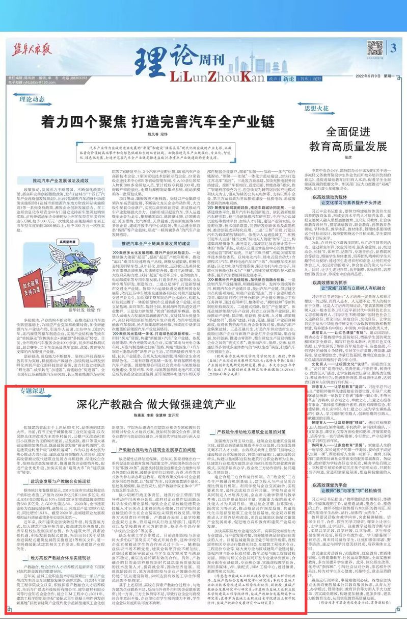 5月9日,《盐阜大众报》理论周刊版刊发了由我校盐城产教融合发展研究中心智库、建筑工程学院教师陈惠惠、建筑工程学院副院长李莉副教授、建筑工程学院教师徐慧琳、袁开军合作撰写的研究报告《深化产教融合 做大做强建筑产业》。