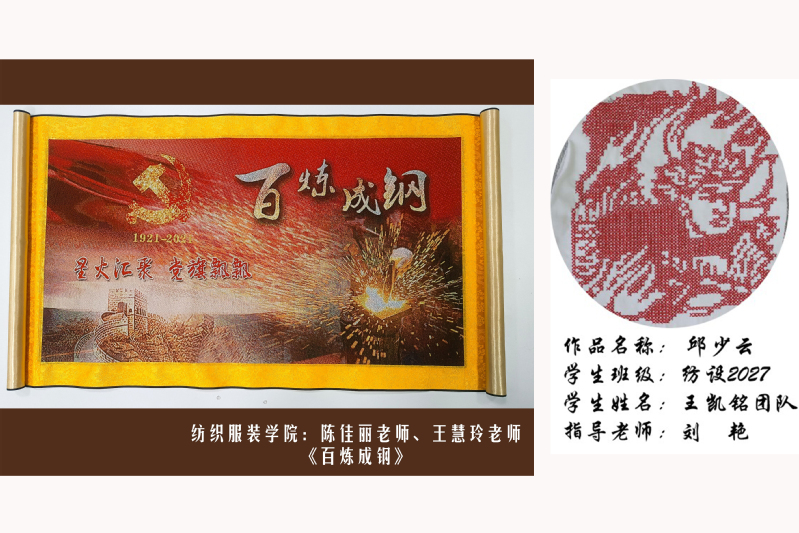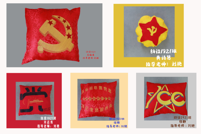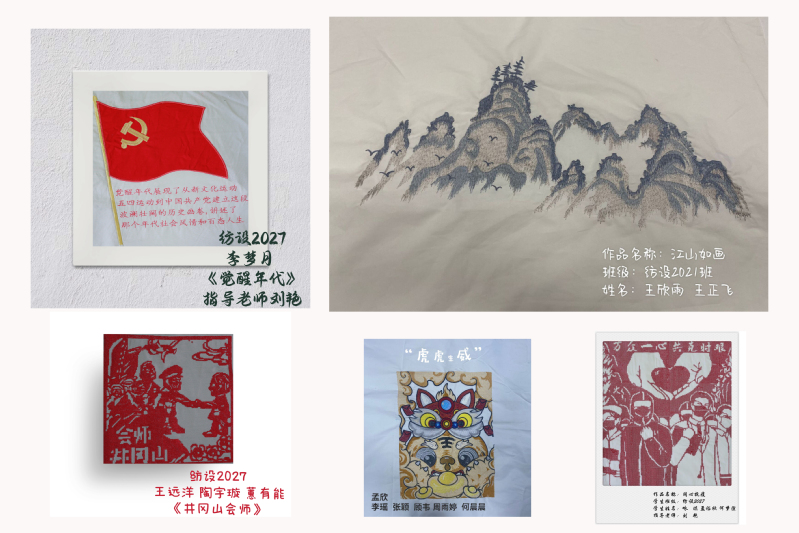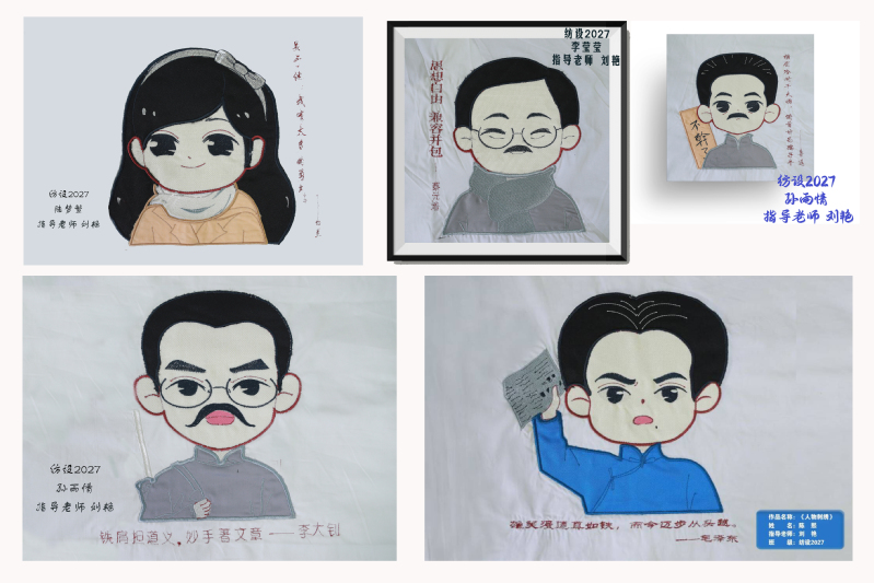 我校落实立德树人根本任务,积极深化课堂教学改革,将思政元素有效融入课堂教学。《刺绣产品设计与制作》教学团队在五四青年节期间,组织学生用一针一线刻画革命先烈,引导学生传承和发扬五四精神,坚定不移听党话、跟党走,以良好精神风貌和优秀作品喜迎党的二十大,献礼建团百年。学校还加强学生专业社团顶层设计,将专业社团与专业核心课程相结合、与职业能力培养相结合,为学生提供学以致用的平台。“大家闺绣”社团成员制作的手工绣品,图案工整绢秀,色彩清新高雅;织彩社社团成员的机绣作品,融入红色文化元素,课程思政协同育人;倾衣社社团成员的DIY作品,工艺精巧细腻,体现无限创意。