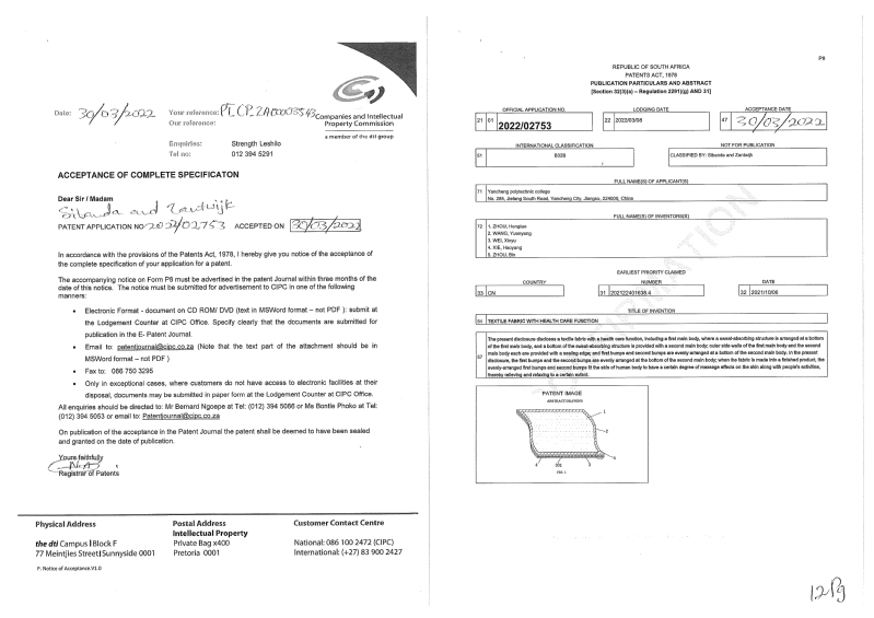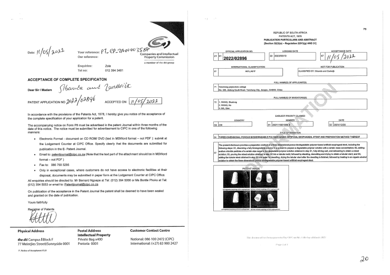 近日,我校生物质功能纺织纤维开发与应用科技创新团队王曙东、周彬、周红涛三位老师通过“Paris Convention for the Protection of Industrial Property(保护工业产权巴黎公约)”途径申请的三项国际发明专利在“一带一路”沿线国家南非获得授权,实现了我校国际发明专利授权“零”的突破。三项专利分别是“Three-Dimensional Porous Biodegradable Polymer-Based Artificial Esophageal Stent Andpreparation Method Thereof”“Method For Preparing Functional Mask Material By Extracting Sericin From Silk Glands Of Castor Silkworms”“Textile Fabric With Health Care Function”。