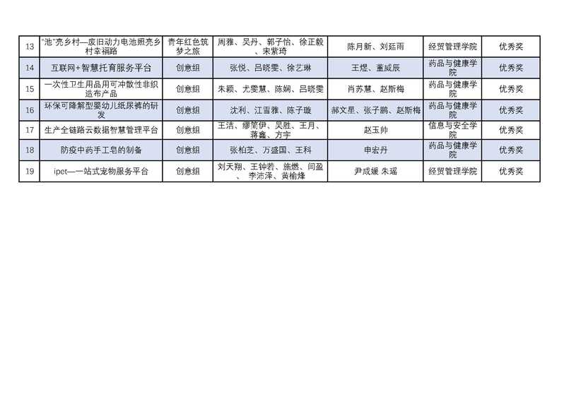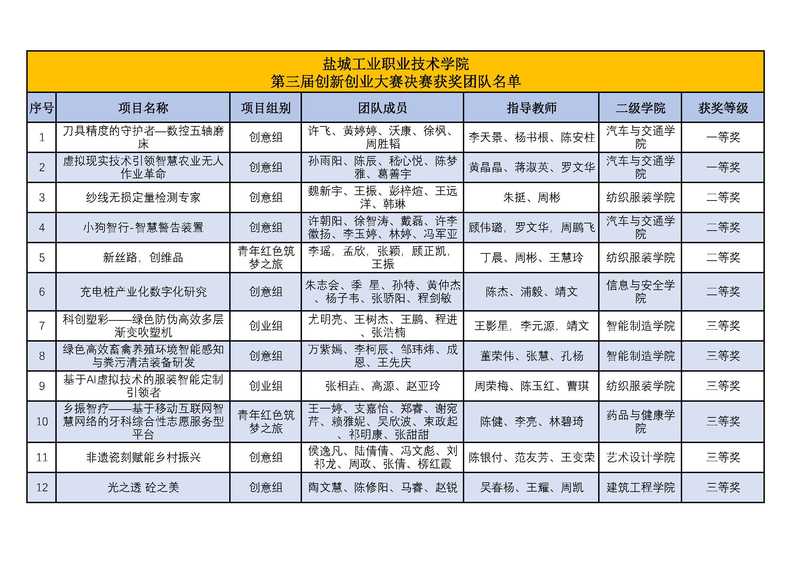 根据《盐城工业职业技术学院关于举办第三届创新创业大赛的通知》(盐工创〔2021〕6号),经二级学院推荐和初赛选拔,共有19个项目入围决赛,学校组织专家对参赛项目团队进行路演评审,共评选出一等奖2项、二等奖4项、三等奖6项、优秀奖7项,现将拟获奖名单予以公布。