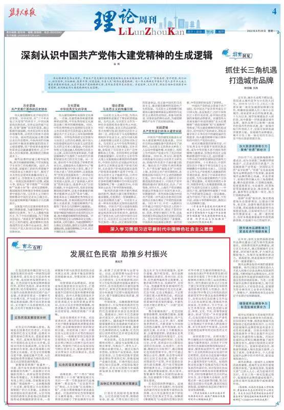 红色民宿是伴随民宿与红色旅游发展而形成的一种新型民宿发展类型,是红色文化活态传承的产物,是民宿再发展的新生力量。《发展红色民宿助推乡村振兴》分析了盐城红色民宿发展现状:红色文化内核融入度低、新媒体营销推广渠道单一、经营者缺乏品牌意识、信息化管理水平不高。从政策、市场、商业三个方面展望了红色民宿发展前景,提出了加快红色民宿发展对策建议:打造红色民宿特色场景体验、整合新媒体推广、红色民宿的跨界融合、政府政策引导。