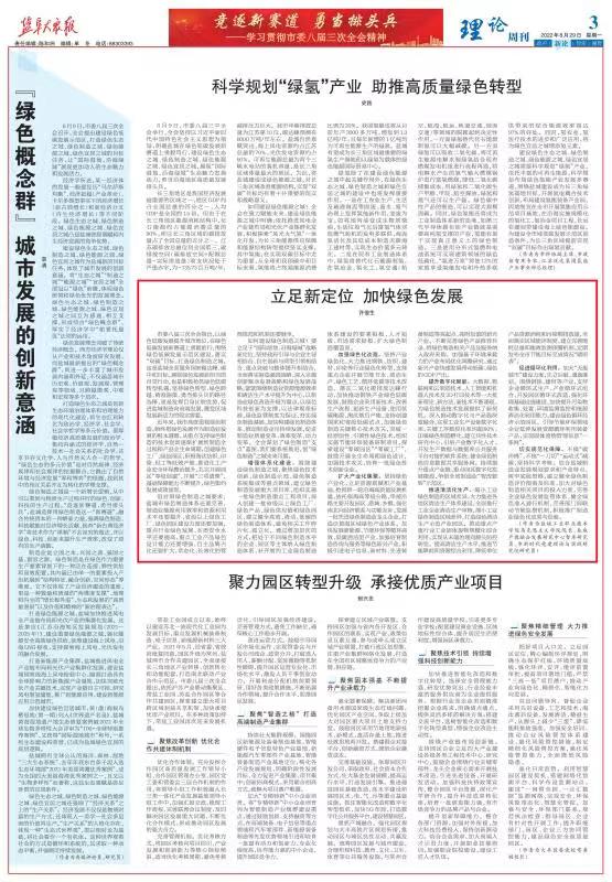 正值盐城市委八届三次全会召开之际,许俊生教授应《盐阜大众报》理论专刊专版约稿,就“落实双碳目标 建设绿色制造之城”提出建议和看法。《立足新定位 加快绿色发展》分析了对照绿色制造之城要求盐城绿色发展存在的问题:绿色制造体系还要完善,制造业能源利用效率和资源利用水平还要提升,省级以上绿色工厂、绿色园区建设力度还要加强,重点行业绿色发展、本质安全水平还要提高,重点工业产品绿色设计能力还要增强,自主品牌占比还要扩大,常态化、长效化的管理规范和机制还要健全。提出建设绿色制造之城的建议:增强体系化建设、加强绿色化改造、扩大产业化集聚、提升数字化赋能、推进清洁化生产、促进循环化利用、切实规范化保障。