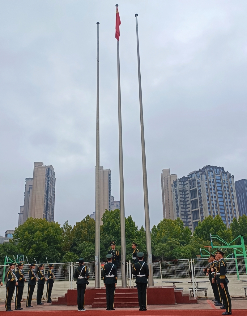 上午6时10分,学校国旗班队员迈着矫健的步伐护送国旗走向升旗台。伴随着雄壮的《义勇军进行曲》,鲜艳的五星红旗冉冉升起。在场全体人员肃然起敬,面向国旗行注目礼,齐声高唱国歌,向伟大祖国致以生日的祝福和崇高的敬意。