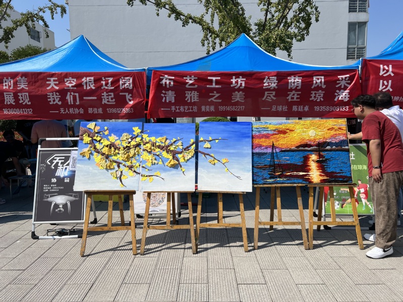 纳新现场人潮涌动,处处可见精心设计的宣传标语和海报。社团巡礼展位前,各个社团纷纷拿出了自己的“看家绝活”:书画社现场展示书法绘画作品,展现中华优秀传统文化的艺术魅力;手工布艺工坊展出一件件精美的刺绣作品,引得过往师生驻足欣赏;唱响音乐社给观众们带来一首又一首青春洋溢的歌谣;吉他社拿出吉他、电钢琴等乐器进行弹奏;此外还有优美的华尔兹、精彩的无人机飞行秀、刺激的花样滑板技巧展示等。