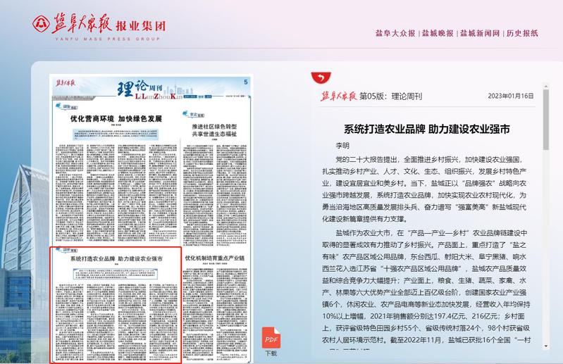 1月16日,《盐阜大众报》理论周刊版刊发了由我校艺术设计学院、盐城产教融合发展研究中心研究员李明老师撰写的研究报告《系统打造农业品牌 助力建设农业强市》。