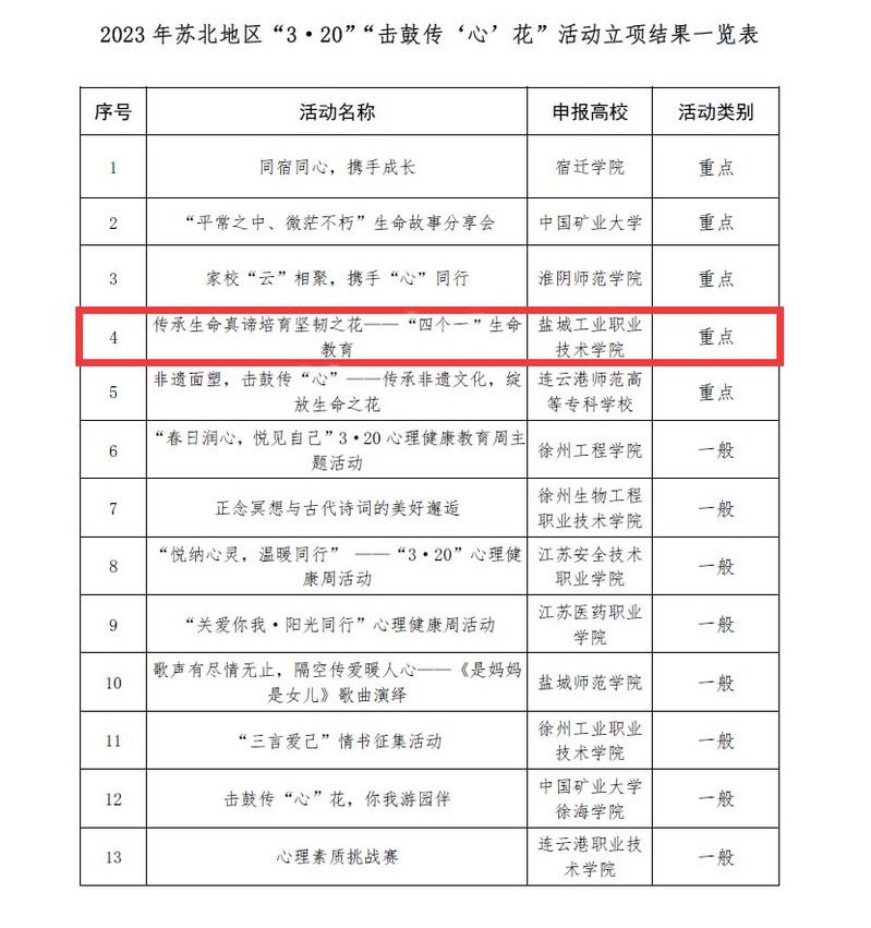 近日,江苏省苏北地区大学生心理健康教育研究中心公布了2023年苏北地区高校大学生心理健康教育“击鼓传‘心’花”活动立项名单,我校申报的“传承生命真谛 培育坚韧之花——‘四个一’生命教育”活动喜获重点立项。据悉,本次活动苏北基地共收集徐、淮、盐、连、宿五市13项活动方案,确立5个重点活动,我校为盐城市唯一重点项目,这是我校继2021年获得江苏省先进集体后,在打造特色心理活动方面的新进展。