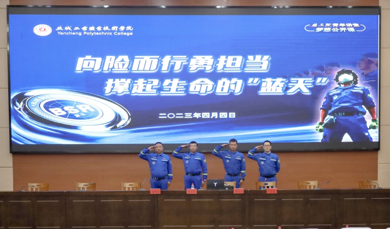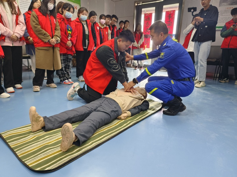 活动第一阶段,救援队一行5人应邀来校,在学术报告厅作《向险而行勇担当 撑起生命的“蓝天”》的专题讲座,救援队队长董光道担任主讲。他从水域救援、高空救援、地震救援、防疫消杀、活动保障等方面全面介绍了救援队的救援救灾工作历程。活动第二阶段,学生代表们走进盐城蓝天救援队,了解救援队发展历程、与救援队队员交流互动、实地参观训练基地、学习急救知识。董光道及其队员们现场授课,详细介绍了急救的具体步骤和注意事项,学生通过模拟假人体验了心肺复苏、人工呼吸、AED除颤等急救操作。