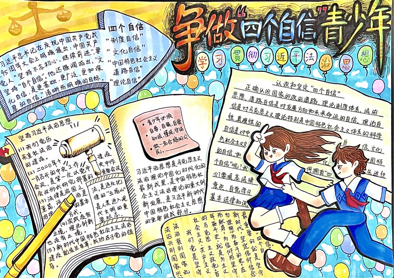 5月8日至14日是第五届全省青少年法治教育周,为进一步学习贯彻党的二十大精神和习近平总书记参加十四届全国人大一次会议江苏代表团审议时的重要讲话精神,坚持以习近平法治思想为指导,进一步加强青少年法治教育,学校面向全体在校青年学生开展了“学习贯彻习近平法治思想 争做拥有‘四个自信’青年”主题手抄报作品比赛。