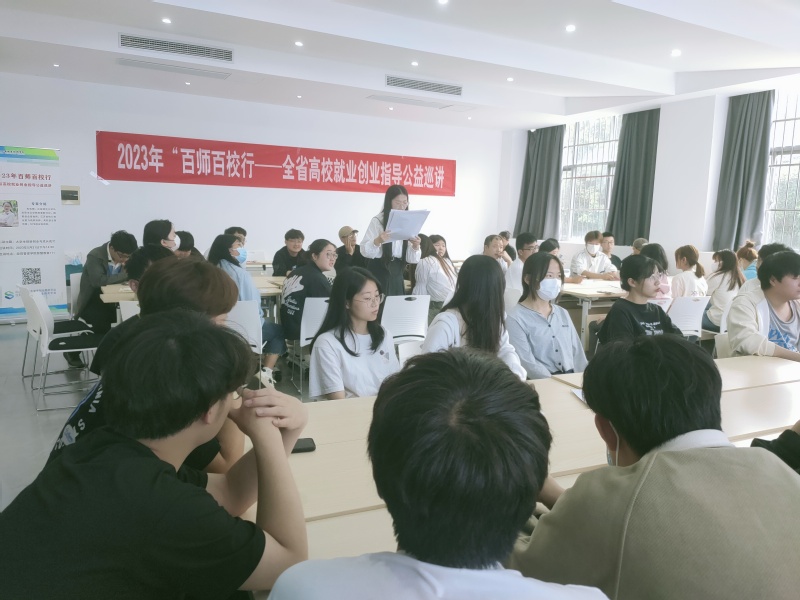 5月31日,2023年“百师百校行——全省高校就业创业指导公益巡讲”活动在学校经贸管理学院智慧教室111举行。江苏师范大学马克思主义学院党委副书记、江苏省大学生就业创业指导专家朱和卿受邀作题为《大学生创新创业与成长成才》的讲座。各二级学院2024届学生代表现场聆听讲座。