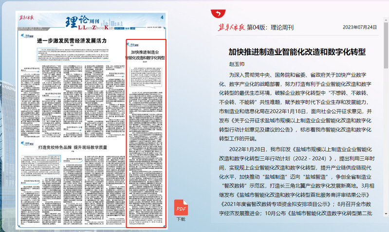 7月24日,《盐阜大众报》理论周刊版刊发了由我校信息与安全学院教师、盐城产教融合发展研究中心研究员赵玉帅老师撰写的研究报告《加快推进制造业智能化改造和数字化转型》。