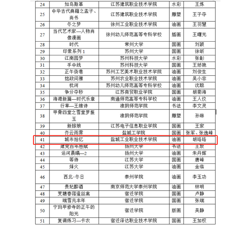 近日,我校艺术设计学院教师胡珞珞的油画作品《城市拾忆》成功入选“时代风华-第六届江苏省高校美术作品展”的现场展览(教师组)。