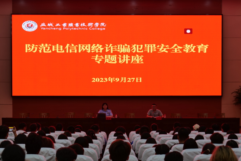 为进一步增强广大师生的反诈意识,增强对电信网络诈骗犯罪的辨别和应对能力,9月27日,学校保卫处联合盐南高新区公安分局科城派出所,在学术报告厅举办了“防范电信网络诈骗犯罪安全教育”专题讲座。科城派出所民警朱红应邀主讲。各二级学院师生代表约200人参加,讲座由保卫处副处长张小玮主持。