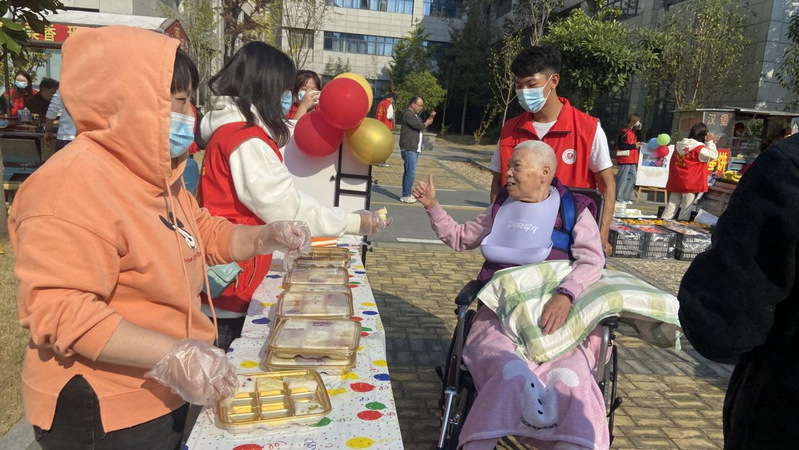 在盐都区智慧养老服务中心,志愿者给老人们发放糕点食品,带着老人们参与汉服体验、投壶游戏、套圈游戏等活动。在志愿者的热情引导和细心照顾下,老人们的脸上都露出了灿烂的笑容,整个活动场地充满了欢声笑语。