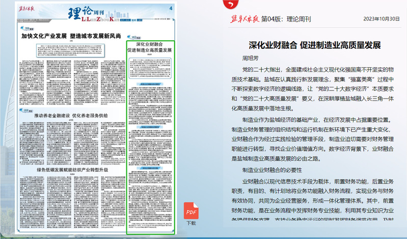 10月30日,《盐阜大众报》理论周刊版刊发了我校盐城产教融合发展研究中心智库研究员、正高级会计师周旭芳执笔撰写的研究报告《深化业财融合 促进制造业高质量发展》。