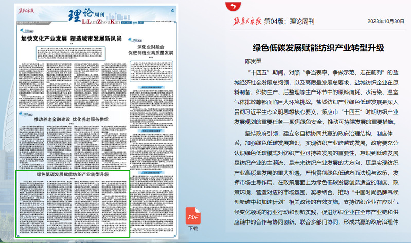 同日,《盐阜大众报》理论周刊版刊发了我校盐城产教融合发展研究中心智库研究员、纺织服装学院副教授陈贵翠老师撰写的研究报告《绿色低碳发展赋能纺织产业转型升级》。