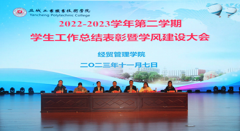 11月7日,经贸管理学院在大学生活动中心礼堂召开2022-2023学年第二学期学生工作总结表彰暨学风建设大会。经贸管理学院在盐领导班子全体成员、辅导员和在校学生参加大会。经贸管理学院团总支书记张艳主持会议。