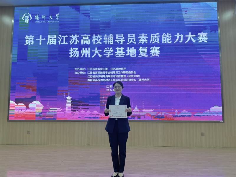 3月25日至26日,由江苏省教育厅主办,江苏省高校辅导员培训与研修基地(扬州大学)协办的第十届江苏高校辅导员素质能力大赛复赛在扬州大学荷花池校区举行。学校艺术设计学院辅导员杨敏老师获得二等奖。